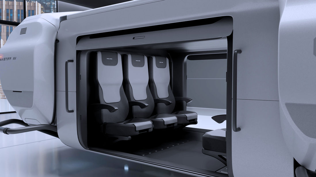 The Mastiff AV is a six-passenger aerial vehicle specifically designed for urban maneuverability. Equipped with eight independent cycloidal propellers, it ensures efficient navigation around complex infrastructures.